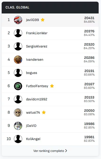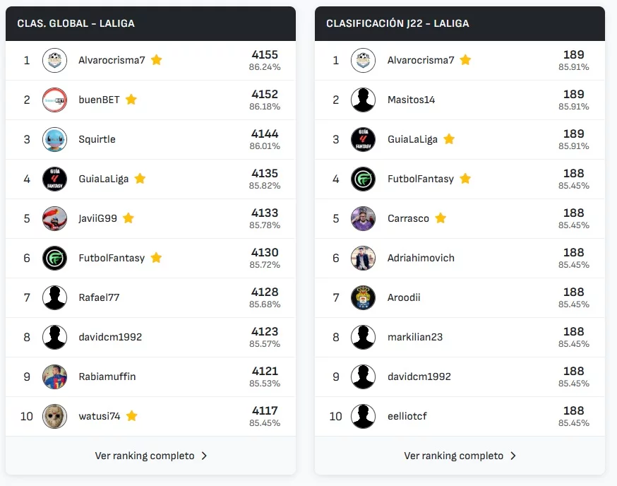 La clasificación global de LaLiga mantiene toda su emoción, con Alvarocrisma recuperando el liderato gracias a su regularidad y a un total de 4155 aciertos acumulados. Además, en el ranking global —que suma todas las competiciones cubiertas por Predicted11 (LaLiga, Premier League, Serie A, Segunda División y Champions League) JaviiG99 se mantiene como líder destacado con 20431 aciertos, demostrando su constancia y dominio a lo largo de múltiples torneos.