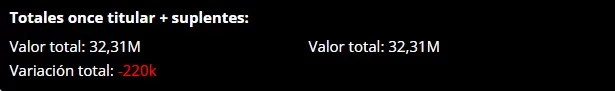 La vista de probabilidad y forma mostrará la probabilidad media del once, la forma media y el total de riesgo de suplencias, facilitando una evaluación rápida del grado de estabilidad de la alineación. En la vista de valores de mercado, los usuarios podrán consultar el valor total del once titular, la variación diaria acumulada y esos mismos datos incluyendo también a los suplentes, más abajo.