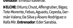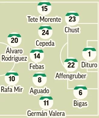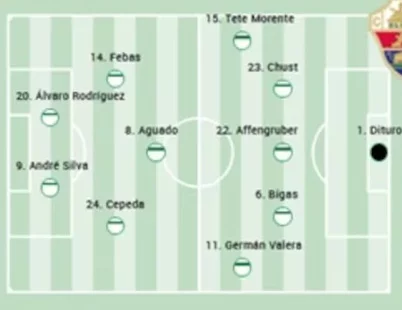 El once titular de Éder Sarabia no debería diferir mucho del mostrado en la última jornada de Liga contra Osasuna, donde se consiguió una portería a cero. La vuelta de Affengruber tras cumplir sanción incluso genera dudas de que se produzca para mover un trío de centrales que cuajó una gran actuación, formado por Pétrot, Chust y Bigas. En portería, también Dituro logró la primera portería a cero en mucho tiempo, por lo que debería ganarse el crédito. Cepeda sería la otra gran duda del once. Martim Neto amenaza su puesto.