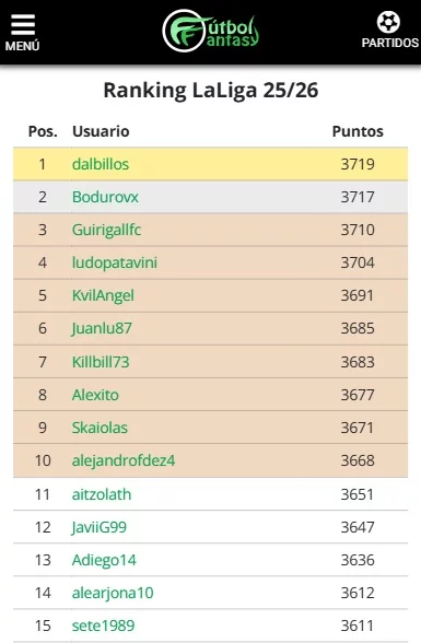 En cuanto al ranking general de LaLiga 25/26, el liderato se pone caliente con dalbillos asaltando el liderato, con 2719 puntos. Muy de cerca le siguen Bodurovx y Guirigallfc, con 3717 y 3710 puntos respectivamente. La pelea en la zona alta está más ajustada que nunca y promete emociones fuertes de cara a las próximas semanas.