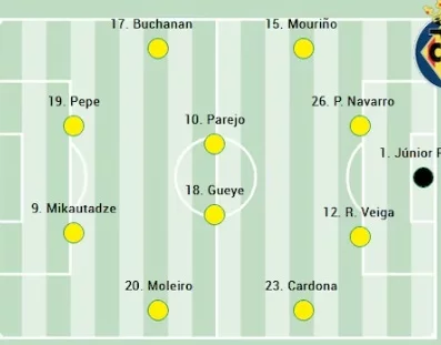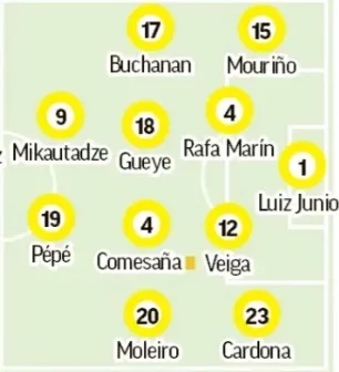 Luiz Junior; Mouriño, Pau Navarro, Rafa Marín, Cardona; Comesaña, Pape Gueye, Buchanan, Moleiro; Mikautadze, Pépé