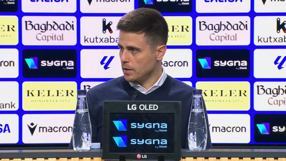 "La derrota es merecida, obviamente. La primera parte entramos bien, la verdad es que entramos bien. Tenemos un palo de Víctor, un disparo de Rosier, pero a raíz de la ocasión de Oyarzabal, desde el saque de banda, hemos desaparecido del campo, básicamente. Y contra la Real, que te presiona al hombre, cuando te obligan a levantar balón es evidente que tienes que ganar la primera o la segunda jugada. Si pierdes todas las primeras y todas las segundas, no puedes tener continuidad en el partido. Entonces, hemos jugado a nivel físico y nos han pasado por encima. No hay debate sobre eso. Porque, al final, todas las ocasiones, todo el peligro venía en transición, tras ganarnos la segunda o cuando intentamos perder la espalda, como en el primer gol, en el penalti. Dicho eso, hay una situación que es clara: haciendo una primera parte donde merecemos ir perdiendo, hay un penalti clarísimo que no se pita. Y si la primera parte termina 2-1, sin merecerlo, repito, pero el fútbol es así. A nosotros nos ha pasado mucho que nos pasen cosas malas mereciendo mucho más. Entonces, si la primera parte hubiera terminado 2-1, igual la segunda es diferente. En la segunda creo que hemos estado mejor, metiendo un mediocentro más. Hemos podido generarle dudas a la hora de emparejarse ellos. Y hemos conseguido tener más continuidad y conseguir meterlos más veces en bloque bajo. El tercer gol, evidentemente, nos ha trastocado, porque si conseguíamos eso de ponernos 2-1 hubiera sido diferente. Pero, bueno, en general es un partido malo y tenemos que levantarnos rápido porque el fin de semana viene otro partido muy difícil."