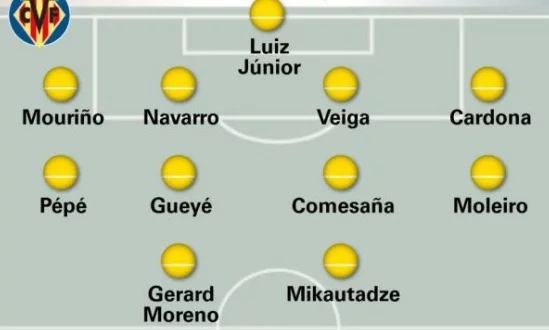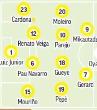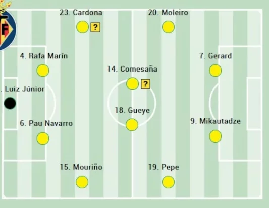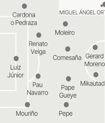 Luiz Junior; Mouriño, Pau Navarro, Veiga o Rafa Marín, Cardona; Pape Gueye, Comesaña, Pépé, Moleiro; Gerard, Mikautadze