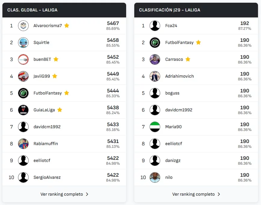 ¡Fca24 gana la jornada 29 de LaLiga en Predicted11 y Alvarocrisma defiende el liderato!