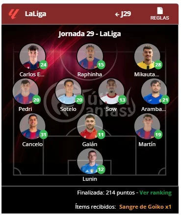 El Fantasy RPG de FútbolFantasy tiene tres vencedores en la jornada 29 de LaLiga. Los usuarios XHELU, Igarkii99 e Ismaa98 se ha proclamado campeón con un total de 214 puntos, gracias a unas alineaciones repletas de aciertos.