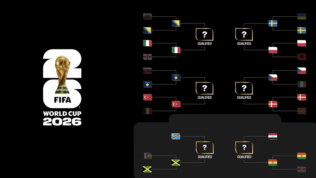 Por su parte, Europa definirá cuatro clasificados más a través de un sistema de llaves directas. En la Ruta A, Italia se medirá ante Bosnia y Herzegovina por un cupo en el Grupo B, junto a Canadá, Catar y Suiza. En la Ruta B, Suecia y Polonia lucharán por entrar al Grupo F, en el que ya están Japón, Países Bajos y Túnez.
