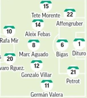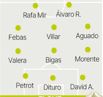 Todo apunta a que Sarabia mantendrá el bloque del último triunfo contra el Mallorca, aunque con la posible entrada de Léo Pétrot por el lesionado Víctor Chust. En la medular, Gonzalo Villar podría ser el elegido para cubrir la posible baja de Diangana y la internacionalidad de Cepeda, con Martím Neto como alternativa. Arriba, con la recuperación de André Silva, se genera la duda con Álvaro para acompañar a Rafa Mir.