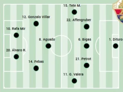 El conjunto ilicitano cuenta con las bajas confirmadas de John Chetauya, Grady Diangana y Víctor Chust han tenido molestias los tres; los dos primeros se han ejercitado al margen y Diangana también ha regresado con problemas físicos. Adam Boayar completa la enfermería, mientras que Héctor Fort no llega a tiempo pese a entrenar ya con el grupo.