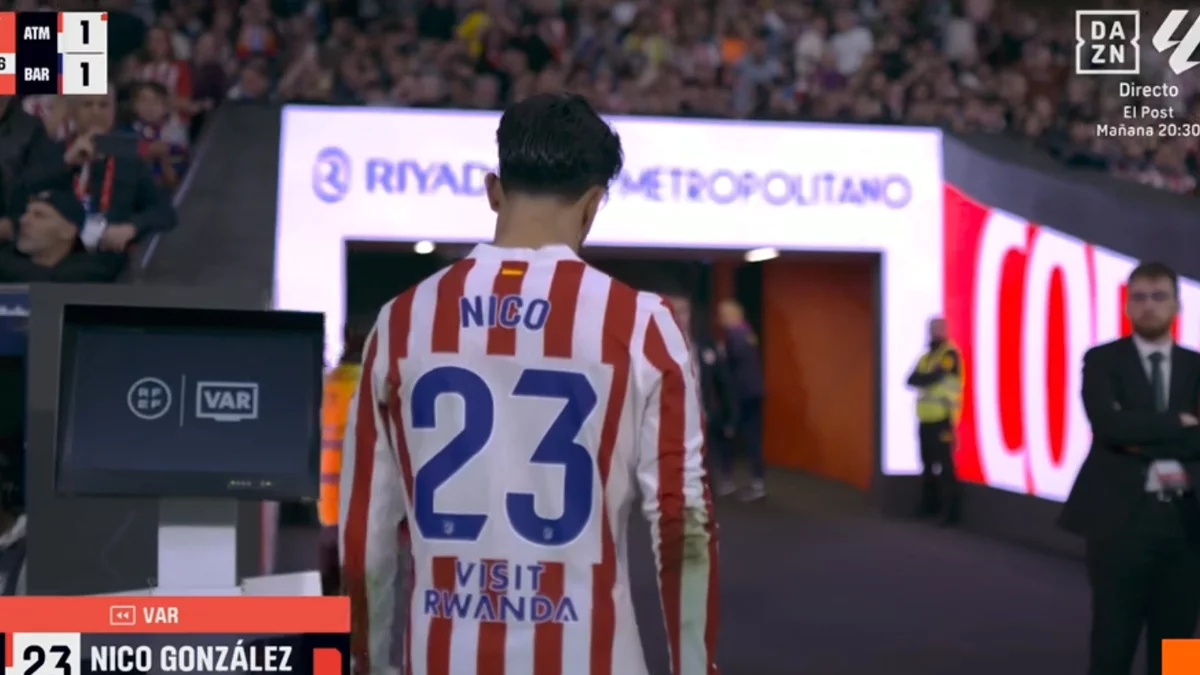 Nicolás González fue expulsado en el Atlético-Barça disputado este sábado en el Riyadh Air Metropolitano y no podrá estar en la próxima jornada liguera ante el Sevilla en el Sánchez-Pizjuán. El zaguero rojiblanco vio primero una tarjeta amarilla en el minuto 22, pero terminó el encuentro antes de tiempo tras una acción sobre Lamine Yamal al inicio de la segunda mitad.