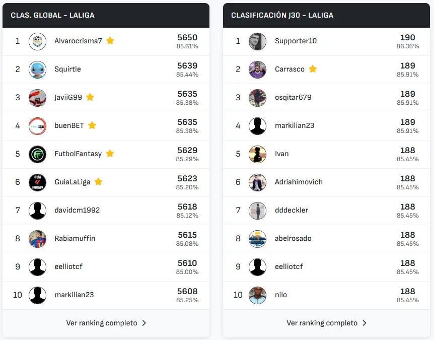¡Supporter10 gana la jornada 30 de LaLiga en Predicted11 y Alvarocrisma defiende el liderato!