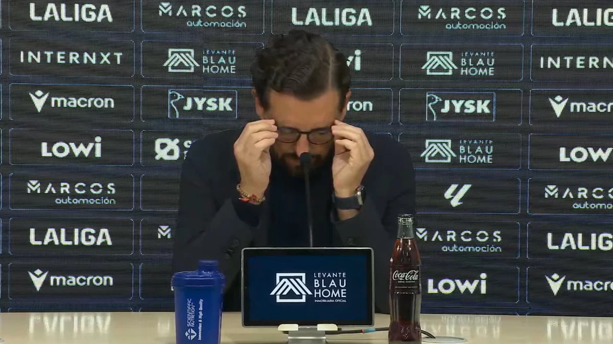 "Bueno, estamos decepcionados porque veníamos con mucha ilusión de hacer un buen partido y conseguir un buen resultado. Durante toda la semana sabíamos que iba a haber un ambiente como el que hemos vivido y que íbamos a jugar contra un equipo que se estaba jugando muchísimo. Nosotros teníamos una oportunidad muy buena de certificar matemáticamente el objetivo de la salvación y la verdad es que es una lectura muy sencilla: nos han superado prácticamente en todo, sobre todo en intensidad, en duelos y en segundas jugadas. Así ha sido casi imposible, porque el equipo nunca ha estado en el partido. Sí que es verdad que el resultado nos mantenía vivos; en ese primer penalti que detuvo Soria albergábamos esperanza, pero, aun así, no hemos conseguido estar cómodos en el partido y, al final, ese gol de Carlos Espí ha hecho que perdiéramos el partido. Está claro que no puedo decir absolutamente nada, pero sí que nos han sancionado demasiado duro, con muchas tarjetas, y la expulsión no la entiendo."