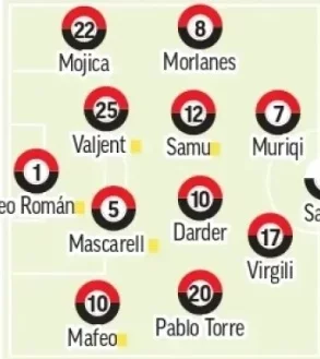 El once no debería ser muy distinto al de las últimas jornadas, con el peculiar rombo que ubica a Darder en la base y a Pablo Torre en la mediapunta. No obstante, la vuelta de Valjent generará dudas en el eje defensivo, con Mascarell, Kumbulla y David López para una posición, sin descartar que Mascarell adelante su posición al centro del campo. Arriba, Jan Virgili apunta a ser el sustituto de Zito Luvumbo.