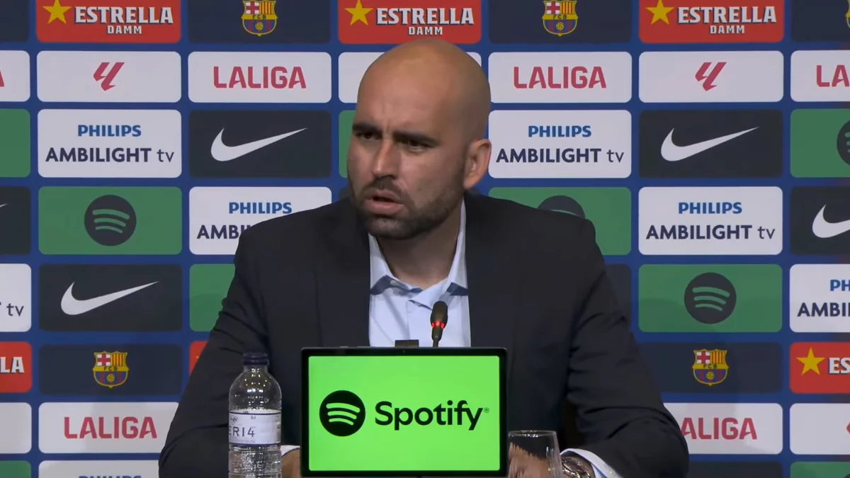 "Bueno, han pasado cosas poco habituales, raras en un partido. Hay que adaptarse a ellas. Esperemos que la persona que ha tenido el problema de salud esté bien, es lo primero. Y lo otro, pues, ha venido también pronto el descanso y creo que ellos también han modificado cosas, han sido capaces de salirnos más de la presión. Nos hemos ubicado peor porque estábamos más cansados a nivel ofensivo. No hemos acabado de ubicarnos tan bien como estábamos en la primera parte y, evidentemente, creo que es muy difícil mantener el nivel de los 45 minutos durante los 90 aquí, contra un rival que tiene tanto talento y, a pesar de las lesiones que ha tenido, salen jugadores de un nivel altísimo y es muy difícil de ajustar. Pero, bueno, creo que hemos sido capaces, de todos los partidos que hemos tenido contra el Barça, desde que yo estoy aquí, de hacer el partido con el que más contento me quedo con la parte ofensiva de salir de la presión de ellos. Es el primer partido en el que no le hacemos gol, pero, aun así, creo que, a nivel de salir de su presión, hemos estado mucho mejor. No estamos en ese puntito, en el último tercio, de atrevernos más, de elegir la mejor decisión para poder hacer más peligro, pero creo que hemos estado mejor ubicados para poder salir de su presión. Nos ha faltado esa verticalidad, ese acierto en las últimas acciones, un par de pases fáciles, sencillos, para quedarnos mano a mano, centros de Rueda o situaciones que nos ha costado girar, pero, bueno, creo que tiene que ver más con un desgaste, con un cansancio, con también un reajuste por parte de Hansi, que con una situación puntual que ha pasado. Venga, que es tarde, a descansar. Gracias."