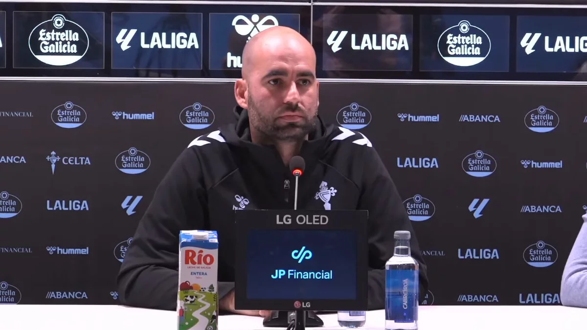 "A mí se me han hecho cortos todos los partidos que he visto a Iago Aspas jugar. Estaría viéndole jugar todos los días, a todas horas, y esa es la realidad. Pero nos toca gestionar las cargas de un jugador que tiene 38 años, que está a punto de cumplir los 39, que tiene muchísimos partidos encima, muchísima presión, responsabilidad en sus piernas y que viene también de un pequeño parón y unas molestias en una zona en la que ha tenido ya roturas. Tenemos que cuidarlo, queremos que esté disponible estos seis partidos y, evidentemente, igual que os pasará a todos vosotros, a mí me gustaría verlo los 90 minutos en el terreno de juego y a su mejor nivel; y, si no, a su mejor nivel, que esté ahí. Pero nos toca gestionarlo y cuidarlo, y entre todos tenemos que, poco a poco, ir asumiendo el rol que tiene que ir adquiriendo Iago Aspas, y que ha adquirido él mejor seguramente que todos los demás, me incluyo, y que nos cuesta y nos duele muchas veces poder verle tan pocos minutos en el terreno de juego. Pero es la realidad y tenemos que asumirla, intentar que los minutos que tenga en el campo sean de calidad. También es una realidad que, hoy en día, los partidos en los inicios son hiperfísicos. Los partidos están mucho más cerca de situaciones de duelo, de pares, en las que hay muchísimo menos tiempo. Probablemente, aunque tenga participación, pueda tener menos incidencia en el juego o un desgaste más en el plano defensivo, y preferimos muchas veces reservarlo para que los minutos sean donde él realmente puede marcar la diferencia. No lo sé, igual podrían haber sido 20. Son circunstancias del partido, pero ahora mismo la realidad es que Iago Aspas no puede jugar 90 minutos, no está para jugar 90 minutos, y tenemos que ir jugando con que pueda estar disponible y que se pueda encontrar bien cuando sale al terreno de juego."