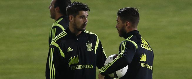 Vicente del Bosque ensayó con un doble nueve en la sesión de entrenamiento a puerta abierta que la Selección celebró este miércoles en Las Rozas. El seleccionador probó un equipo radicalmente diferente al del día anterior, esta vez con Sergio Ramos y Piqué como pareja de centrales y Morata y Alcácer como tándem de delanteros.