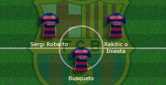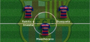 Otra opción, mucho más defensiva, es la de juntar a Busquets y Mascherano en un doble pivote defensivo. Esta opción fue utilizada por Luis Enrique en la temporada anterior en partidos ante rivales fuertes. Busquets se coloraría por delante,quedando más liberado, mientras que Mascherano haría de cierre. Para ello sería necesario recuperar a Piqué tras la sanción. Sin Vermaelen, lesionado, Mathieu y Bartra serían los otros centrales disponibles cuando Mascherano adelante su posición.