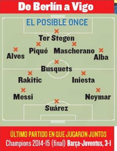 Por primera vez desde la final de la Champions League en Berlín, Luis Enrique podría alinear mañana en Vigo a su once de gala, manteniendo a Ter Stegen en la portería por Claudio Bravo, que sigue recuperándose de su lesión. El técnico azulgrana recupera a Gerard Piqué, ausente los últimos cuatro partidos de Liga por la roja que vio en la vuelta de la final de la Supercopa de España en el Camp Nou ante el Athletic, y en consecuencia, apostará por Gerard en el eje de la zaga y el resto de sus mejores hombres.