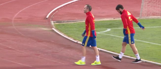 Andrés Iniesta e Isco Alarcón saltaron al césped en la primera sesión de la Selección española durante esta concentración, pero se retiraron al gimnasio tras la charla inicial de Vicente Del Bosque sobre el césped. Isco con una pequeña sobrecarga e Iniesta por precauación. El resto del grupo trabajó sobre el campo a las órdenes de Vicente del Bosque. Sefútbol lo confirmó después a través de su cuenta de Twitter. Antes habían escuchado la charla del entrenador entre risas de todo el equipo. Además, varios aficionados entonaron cánticos a favor de Iker Casillas.