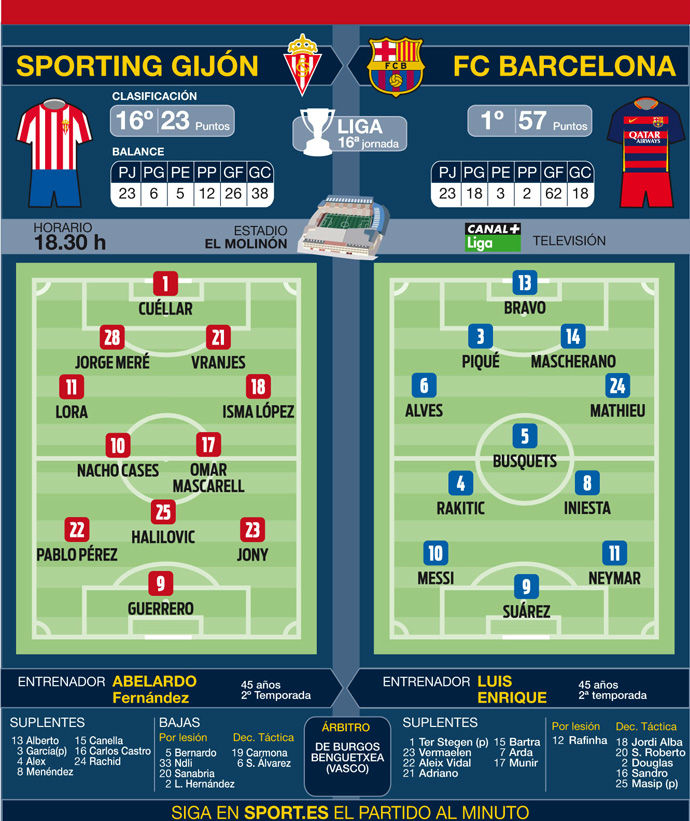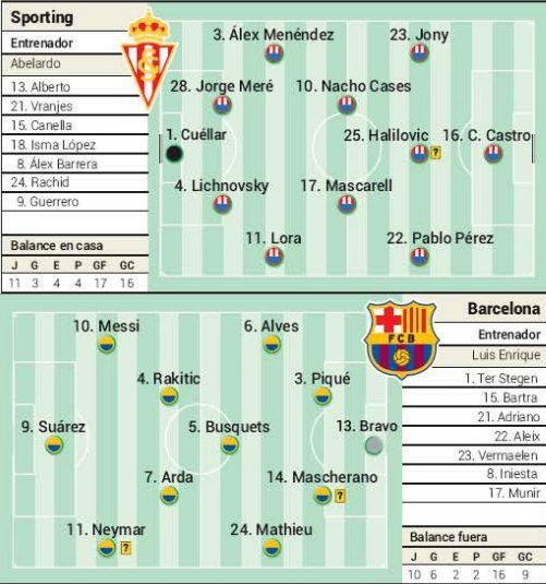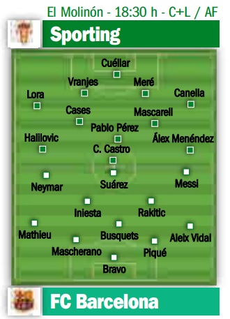 Sporting: Cuéllar; Lora, Lichnovsky, Meré, Canella; Mascarell, Cases; Pablo Pérez, Halilovic, Menéndez; Carlos Castro