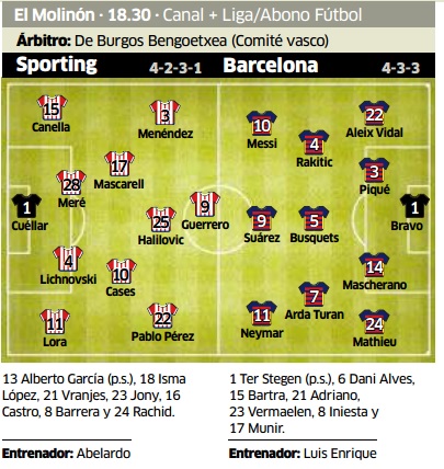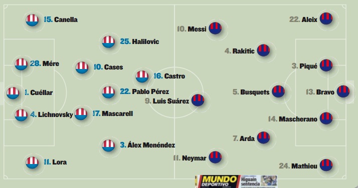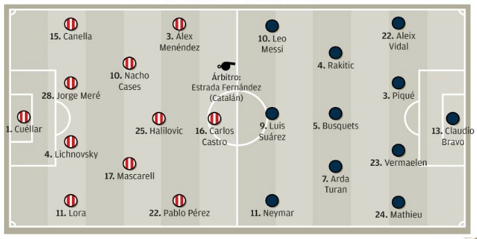 Barcelona: Bravo; Adriano, Mathieu, Piqué, Vidal; Busquets, Arda, Rakitic; Messi, Suárez, Neymar
