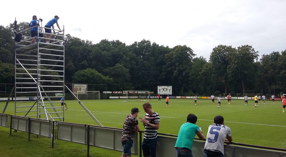 Pako Ayestarán ha dirigido parte de la sesión de hoy en Horst subido a un andamio, el que usa uno de los scouting del club para grabar los entrenamientos. Ayestarán ha decidido tener una visión desde arriba para ver los movimientos de sus futbolistas en un partido modificado.El Valencia apura su último día en Holanda.