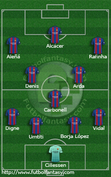 XI #FCBarcelona: Cillessen; Aleix Vidal, Borja López, Umtiti (Nili 68'), Digne; Carbonell (André Gomes 68'), Denis Suárez, Arda; Rafinha, Aleñá (Cardona 75'); Alcácer