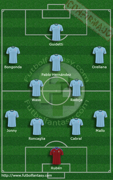 XI #RCCelta: Rubén; Mallo, Cabral, Roncaglia, Jonny; Radoja, Wass (Marcelo Díaz 63'); Orellana (Sisto 82'), Pablo Hernández, Bongonda; Guidetti (Sergi Gómez 91')