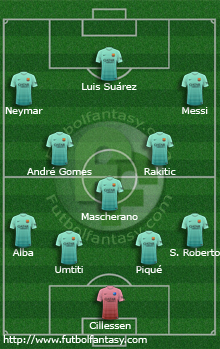 XI #FCBarcelona: Cillessen; Sergi Roberto, Piqué, Umtiti, Alba; Mascherano, Rakitic (Denis Suárez 58'), André Gomes (Rafinha 72'); Messi, Neymar; Luis Suárez