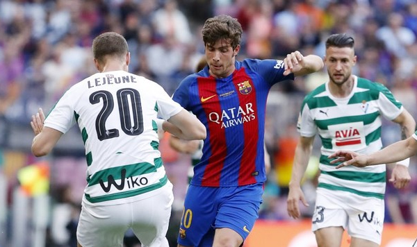 Las pruebas realizadas este lunes a Sergi Roberto han confirmado que sufre una elongación en el aductor de la pierna derecha y el tiempo aproximado de baja es alrededor de 10 días. El lateral del FC Barcelona tuvo que ser sustituido en el descanso por André Gomes ante el Eibar por culpa de unas molestias.