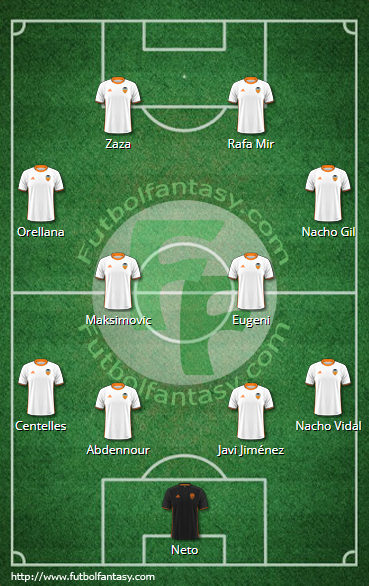 0- Valencia: Neto, Nacho Vidal, Javi Jiménez, Abdennour, Centelles, Nacho Gil, Eugeni, Maksimovic, Orellana, Rafa Mir, Zaza.