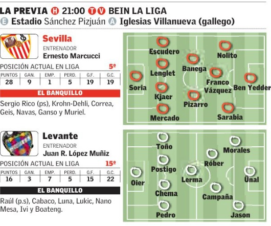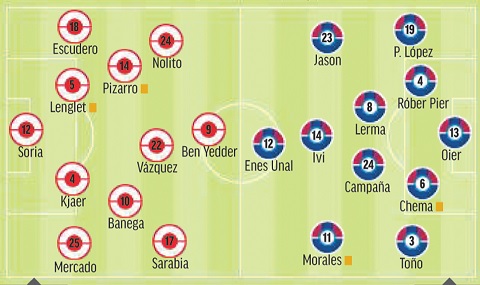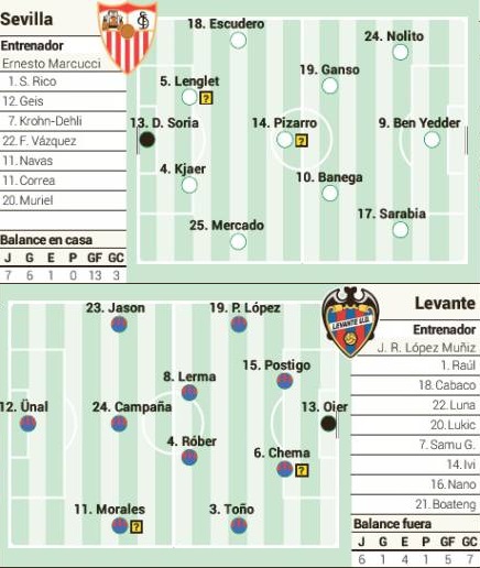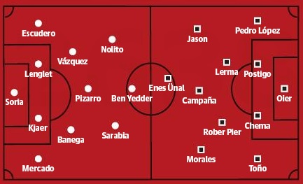 Sevilla: Soria; Mercado, Kjaer, Lenglet, Escudero; Pizarro, Banega; Sarabia, Ganso, Nolito; Ben Yedder.