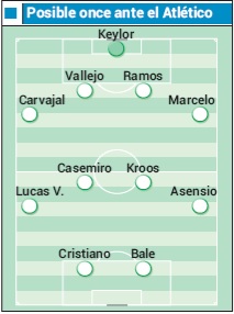 En él, se destacan las ausencias de Varane (que ayer trabajó al margen), Isco, Modric y Benzema. Las novedades respecto al once que jugó el martes serían Vallejo, Lucas, Asensio y Bale.