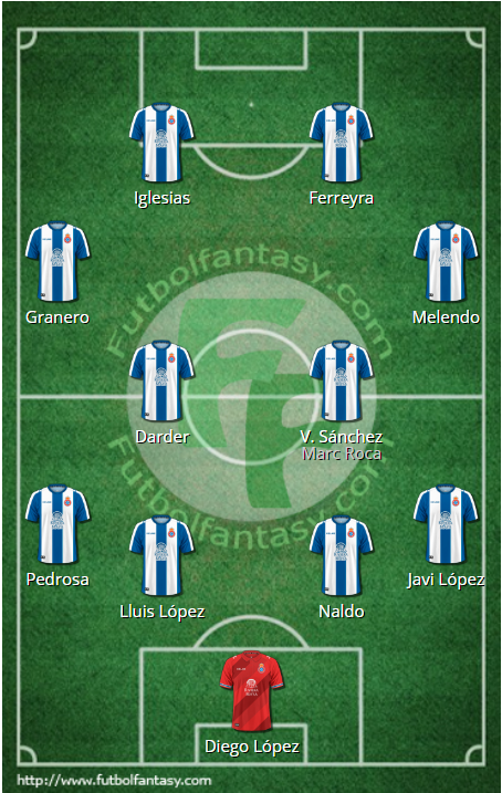 El once, a la espera de que se resuelva la duda en la medular, estará formado por Diego López; Javi López, Lluis López, Naldo, Pedrosa; Melendo, Marc Roca o Víctor Sánchez, Darder, Granero; Ferreyra y Borja Iglesias.
