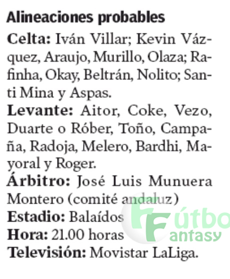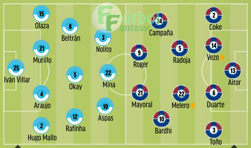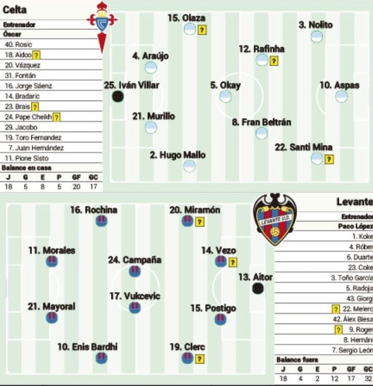 Celta: Iván Villar; Kevin, Araujo, Murillo, Olaza; Rafinha, Okay, Beltrán o Bradaric, Nolito; Santi Mina, Aspas.