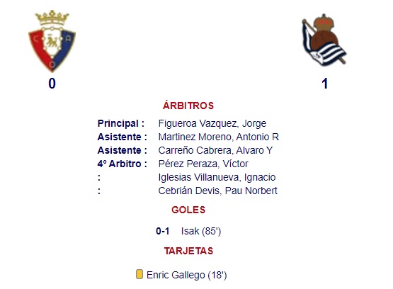El árbitro encargado de dirigir el encuentro de este sábado por la tarde en el Sadar entre Osasuna y Real Sociedad, Jorge Figueroa Vázquez, ha decidido otorgar el único tanto del encuentro a Alexander Isak, después de que las televisiones y los proveedores de estadísticas se lo apuntaran a Juan Pérez en propia en una primera instancia.