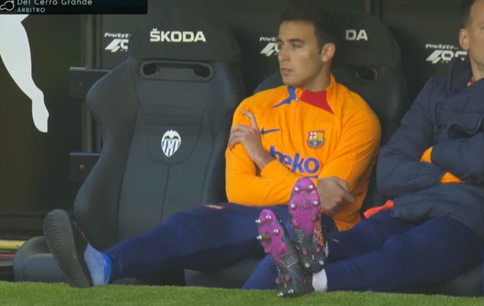 Eric García fue el primer cambio del Barcelona durante el partido de este domingo por la tarde en Mestalla, contra el Valencia. El central barcelonés de 21 años dejó su sitio a Mingueza en la reanudación y las cámaras captaron al jugador sentado con una especie de bolsa rodeando su muslo derecho.