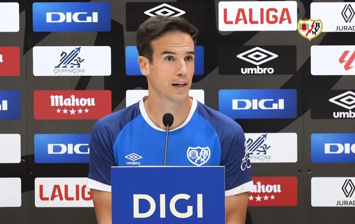 "Sí, estoy de acuerdo en que es un jugador que no teníamos. Tiene unas características muy concretas, es un jugador que podemos etiquetar como 9 de área o rematador, de los que nosotros carecíamos. Sí que tenemos gente que puede rematar en área, que puede llegar, que puede hacerlo, pero él quizá nos da variantes que antes no disponíamos. Creo que su adaptación es muy buena. Hago mucho énfasis siempre en la relación personal que se establece cuando alguien llega a un vestuario; me parece muy importante porque es el primer paso para rendir. Si esto no funciona, si no hay química o conexión con el resto de la plantilla, probablemente o eres excelente o te afectará en tu juego. El vestuario del Rayo, en esto, es ejemplar: te lo entregan. Así ha sido con él. Es educado, buena persona, tiene ganas de obtener rendimiento. Ahora le queda, como vamos viendo, ir adaptándose igual que Fran Pérez y los jugadores nuevos que llegan, adaptándose a todo. Pero creo que las adaptaciones de todos los jugadores que han llegado son muy positivas, y ahora es parte de mi trabajo intentar obtener el rendimiento de ellos."