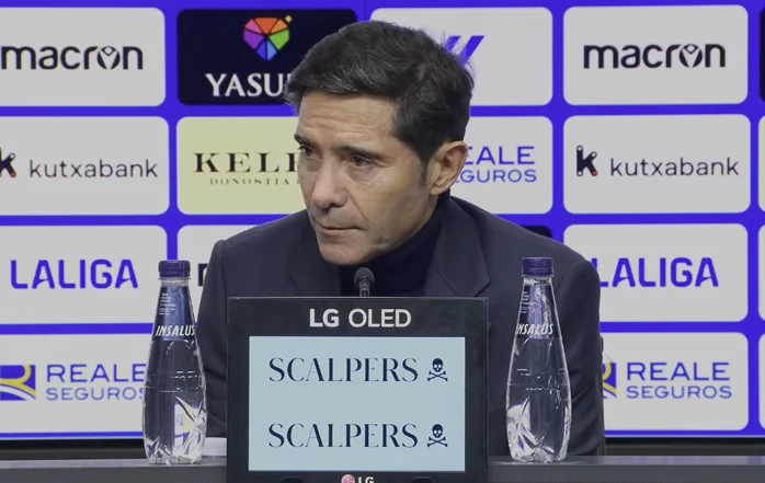 "Bueno, yo, a ver, creo que hubo, sobre todo en el inicio, tuvimos algún problema en algunos ajustes, que quizás también nos faltó un poquito de balón a progresar en el juego, sobre todo yo creo que del minuto 15 al 30 o así más o menos y, bueno, pues ahí nos generó problemas. Luego, pues, es un equipo que acumula futbolistas por delante del balón. Brais ve muy bien los espacios a la espalda de los centrocampistas y luego, pues, da muy buenos pases de progresión, ya sea por zona de participación o zona contraria. Kubo y Gonçalo Guedes son dos jugadores que están en un altísimo nivel, absolutamente determinantes con la participación de Carlos. Luego, pues, salió Barrenetxea igual. Teníamos que intentar, pues, tapar muy bien el pase fuera, dentro, a la espalda del lateral. Creo que lo hicimos bien y, bueno, pero la Real generó una situación de pase atrás que cortó muy bien Mouriño y, como nosotros, después metimos el gol. Y luego, pues, en el segundo tiempo, a raíz del 1-2, todavía yo creo que fueron con más convicción en presión a la pérdida y en presión alta. Luego tienen buen pie para sacar pases hacia adelante y, bueno, nos generaron problemas, ¿no? Y también, pues, con tiros desde fuera. Ocasiones claras desde dentro del área, afortunadamente, no les permitimos muchas, pero sí que en esa fase también sufrimos, yo creo que lo que hablamos al primer tiempo y después del 1-2. Cuando ya parecía que lo teníamos solventado y dominado, cometimos ese pequeño error y, bueno, pues una acción magistral de Barrenetxea metió a la Real totalmente en el partido. Bueno, aquí es muy complicado, muy complicado y hay que estar preparado para, en el transcurso del partido, pasar por fases donde puedas ser dominador y donde muchas puedas ser dominado. Y cuando eres dominado tienes que tener solvencia y creo que la hemos tenido."