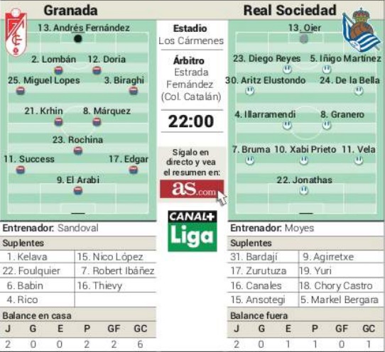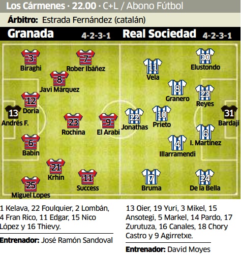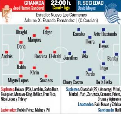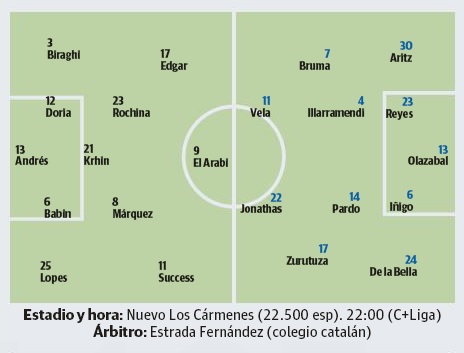 Granada CF: Andrés Fernández; Miguel Lopes, Babin, Doria, Biraghi; Krhin, Javi Márquez, Rochina; Success, Edgar, El Arabi
