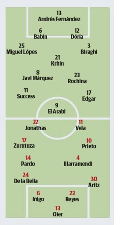 Real Sociedad: Barjadí; De la Bella, Diego Reyes, Iñigo Martínez, Mikel González; Illarramendi, Rubén Pardo; Bruma, Canales, Carlos Vela, Jonathas