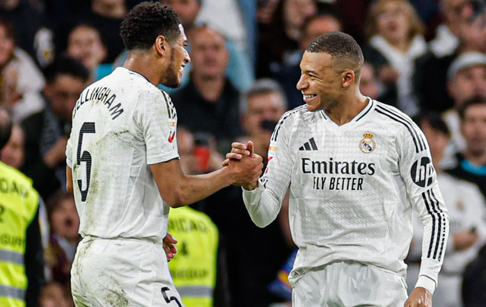 Jude Bellingham roba un balón a un jugador contrario pero no recupera el balón.