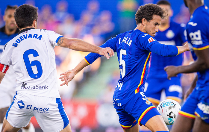 Jon Pacheco roba un balón a un jugador contrario pero no recupera el balón.
