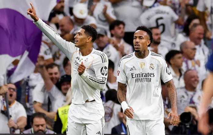 Jude Bellingham roba un balón a un jugador contrario pero no recupera el balón.