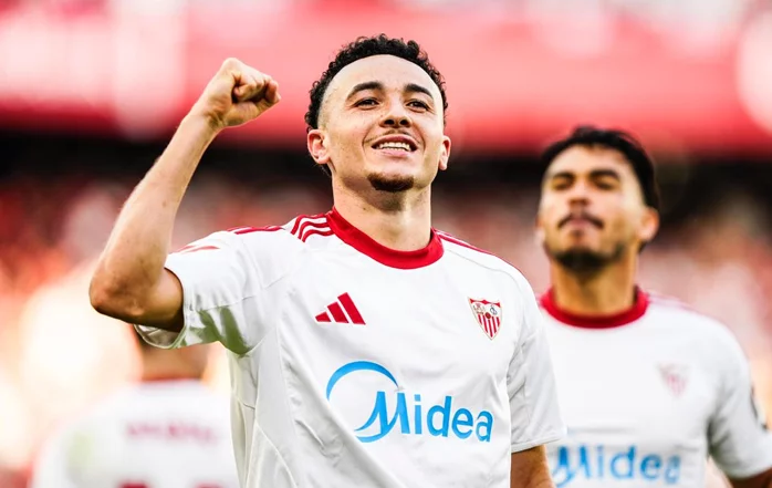 Tanguy Nianzou roba un balón a un jugador contrario pero no recupera el balón.