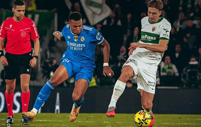 Eduardo Camavinga roba un balón a un jugador contrario.